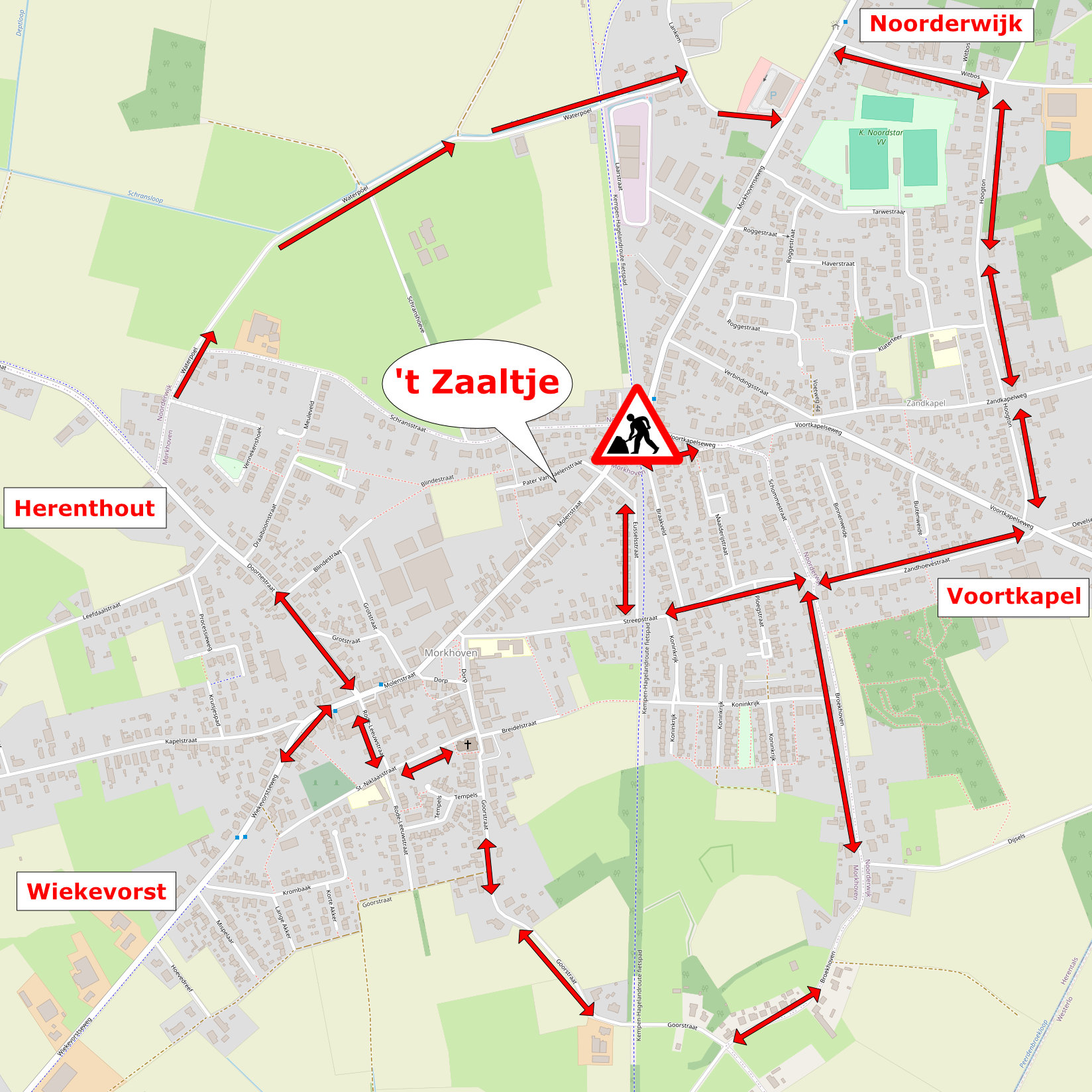 Vanaf Noorderwijk/Voortkapel kan u ons bereiken via Witbos, Hoogton, Zandhoevestraat, Streepstraat, Eusselsstraat en Pater Van Baelenstraat.